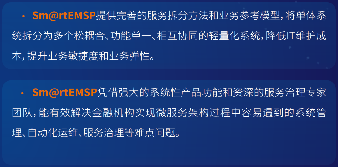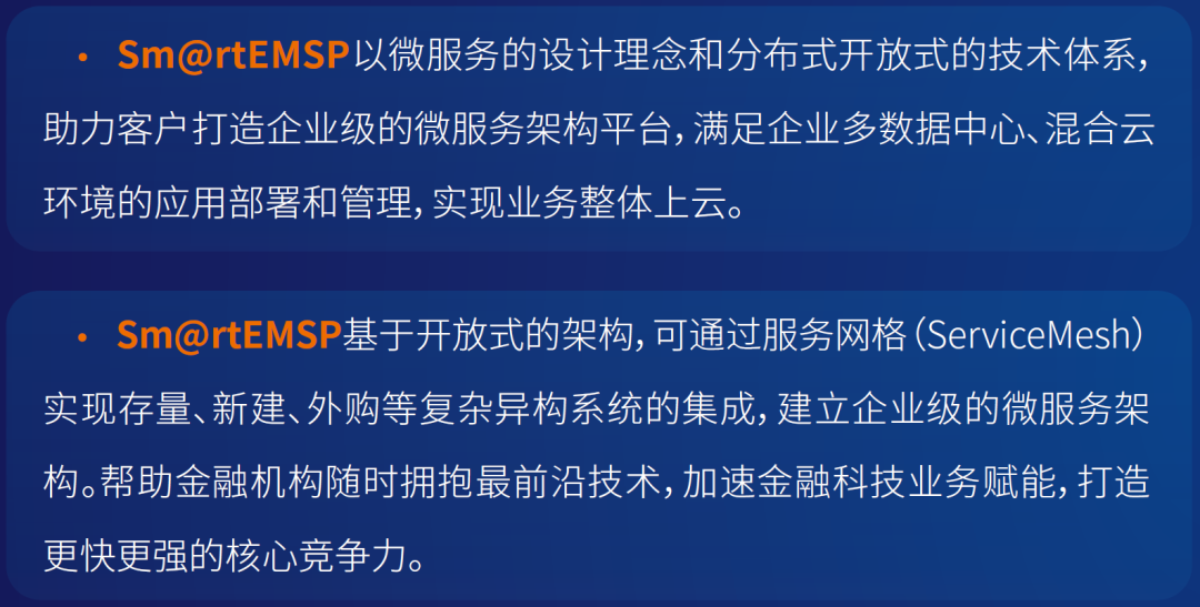 产品功能完善、性能更优、部署更快、扩展性更强、安全稳固,帮助金融机构迅速打造微服务化、自动化、智能化和云化的企业级分布式架构体系。Sm@rtEMSP已在国内多家金融机构落地实施并获得市场的高度认可。