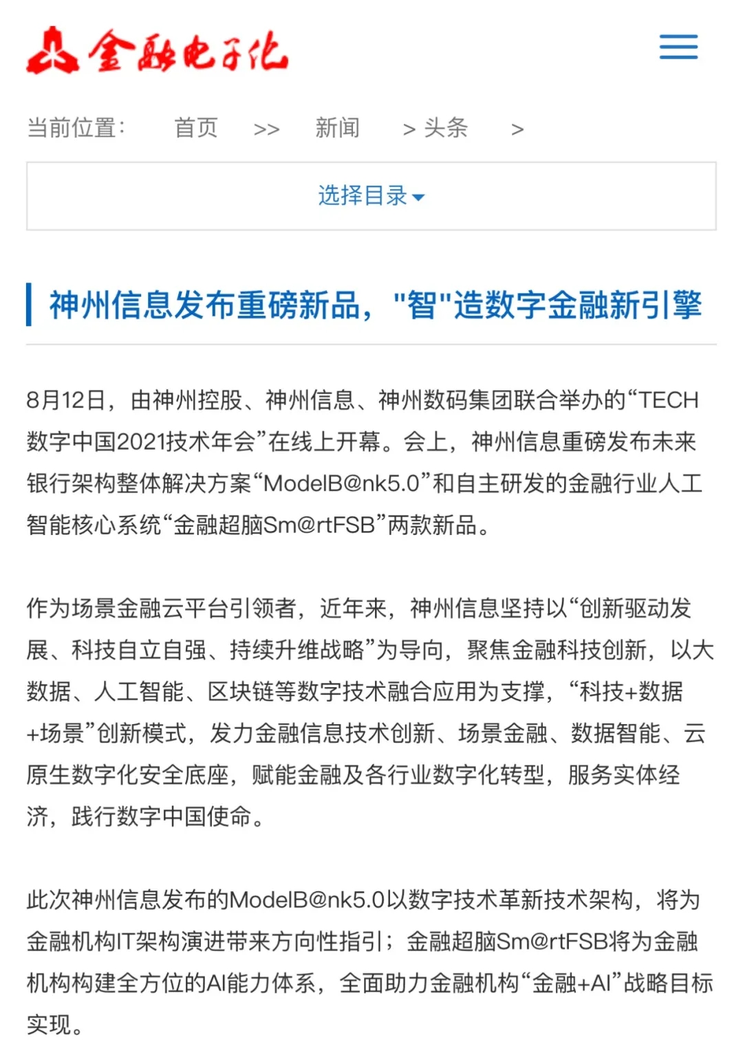 8月12日,由神州控股、BB贝博艾弗森官网、bb贝博艾弗森集团联合主办的“科技自强、数据融通、场景创新——TECH数字中国 2021技术年会”云上盛大启幕,发布神州信创云、ModelB@nk5.0、金融超脑Sm@rtFSB、云原生数字化安全底座、园区智能体等重磅产品,国内各大权威、影响力媒体多角度多频次对盛况进行报道!